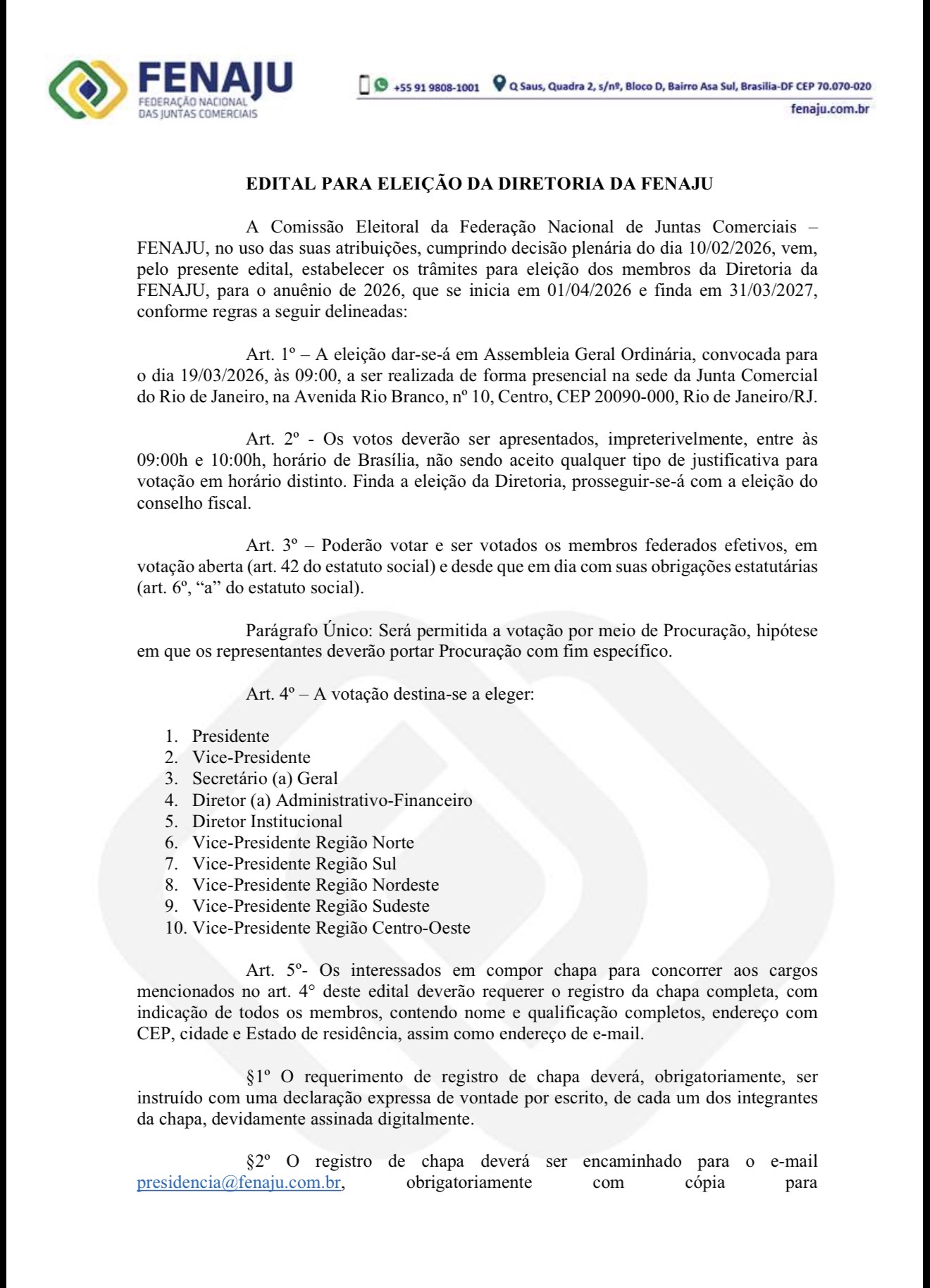 FENAJU, no uso das suas atribuições, cumprindo decisão plenária do dia 10/02/2026, vem, pelo presente edital, estabelecer os trâmites para eleição dos membros da Diretoria da FENAJU, para o anuênio de 2026, que se inicia em 01/04/2026 e finda em 31/03/2027, conforme regras a seguir: