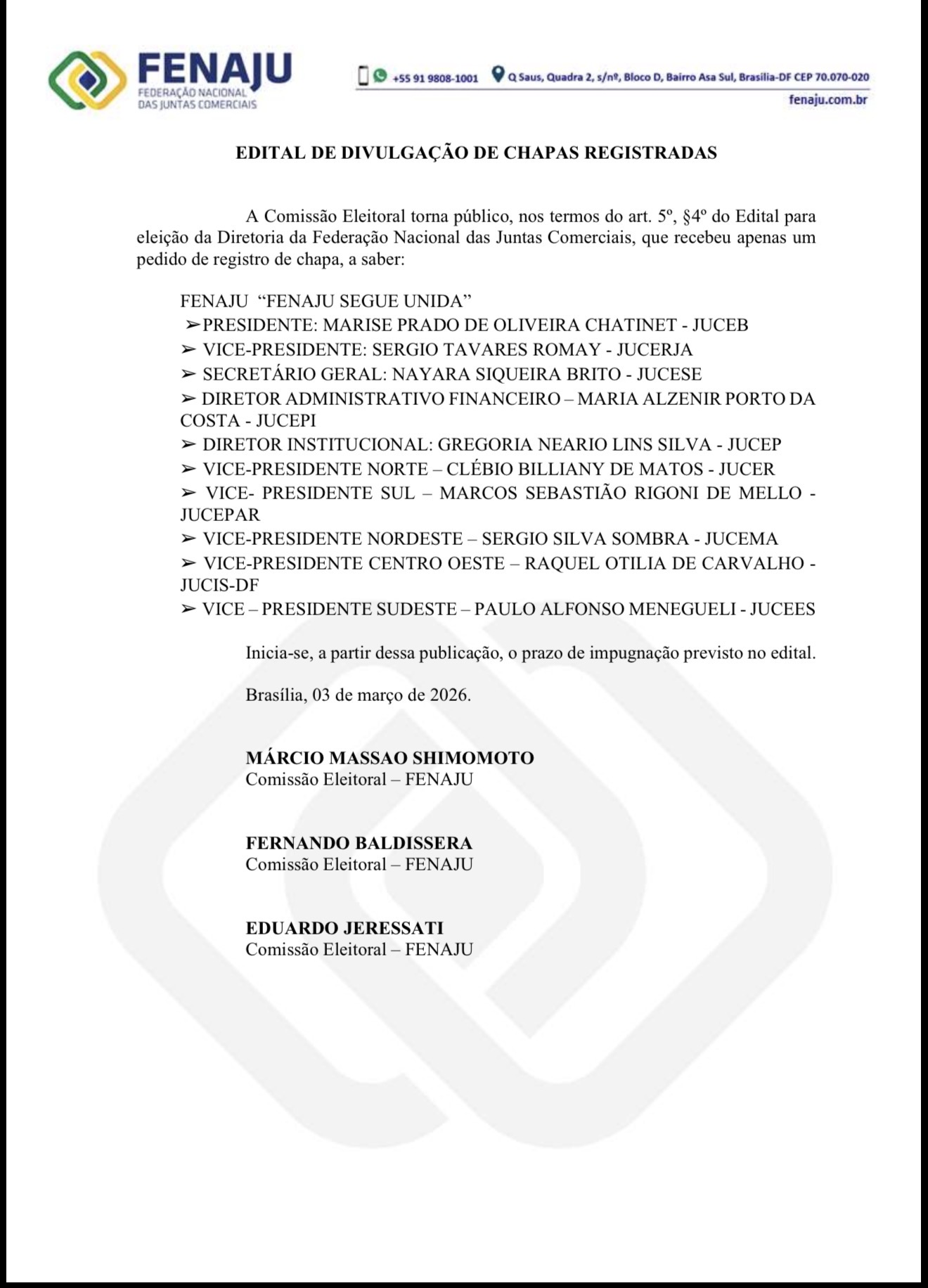 A Comissão Eleitoral torna público, nos termos do art. 5º, §4º do Edital para eleição da Diretoria da Federação Nacional das Juntas Comerciais, que recebeu apenas um pedido de registro de chapa.